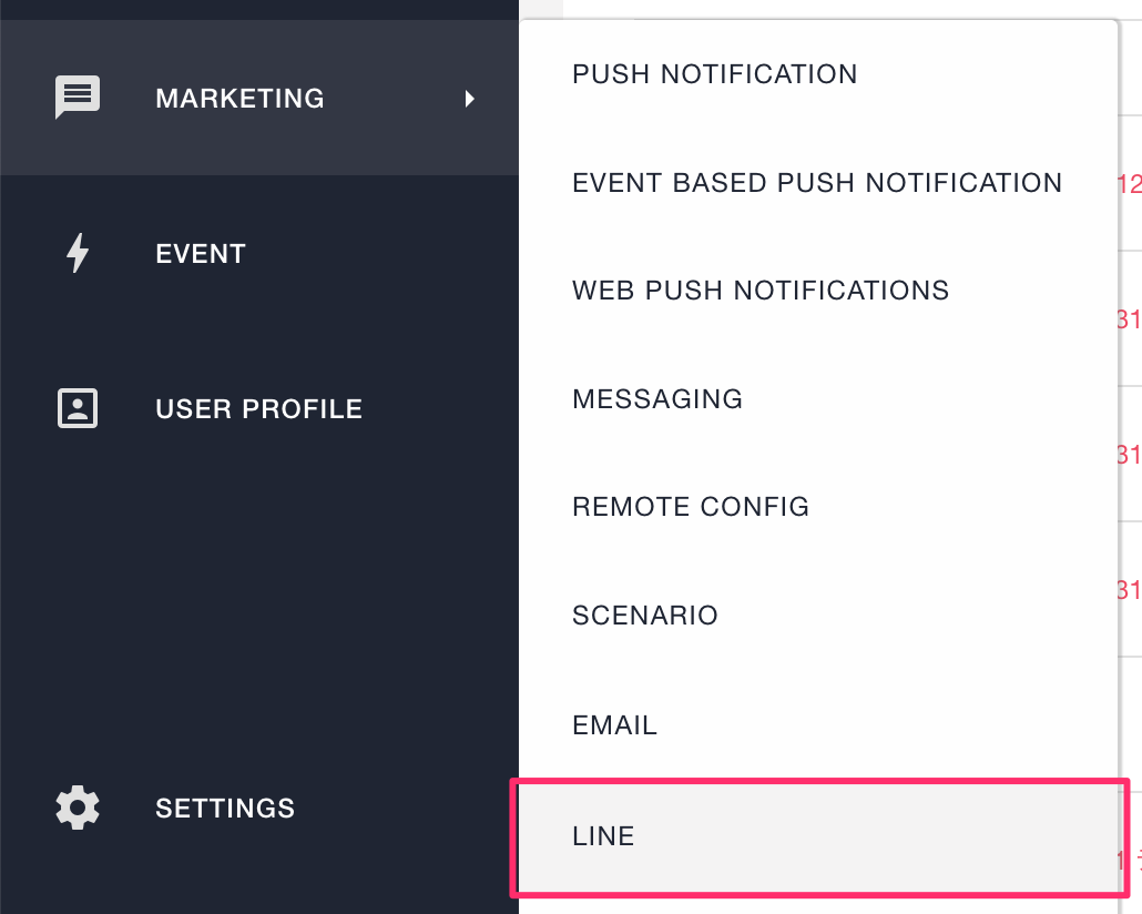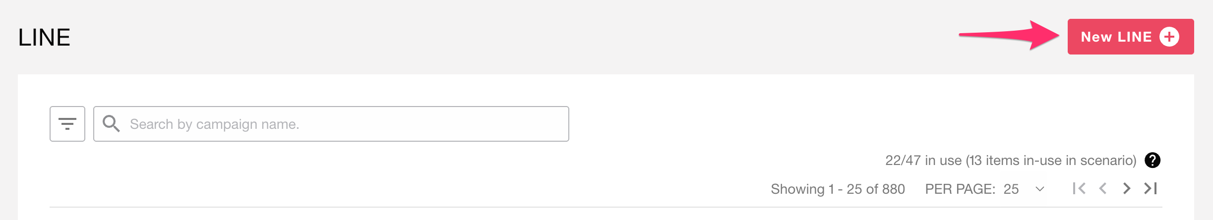 Log in to the dashboard, click 'Marketing' → 'LINE' from the left menu, and go to the LINE campaign list page.