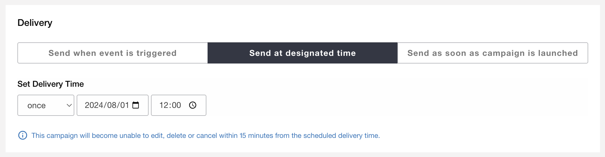 Specify the delivery date and time to send a message only once. You cannot set a past date or a time within 15 minutes from now.
