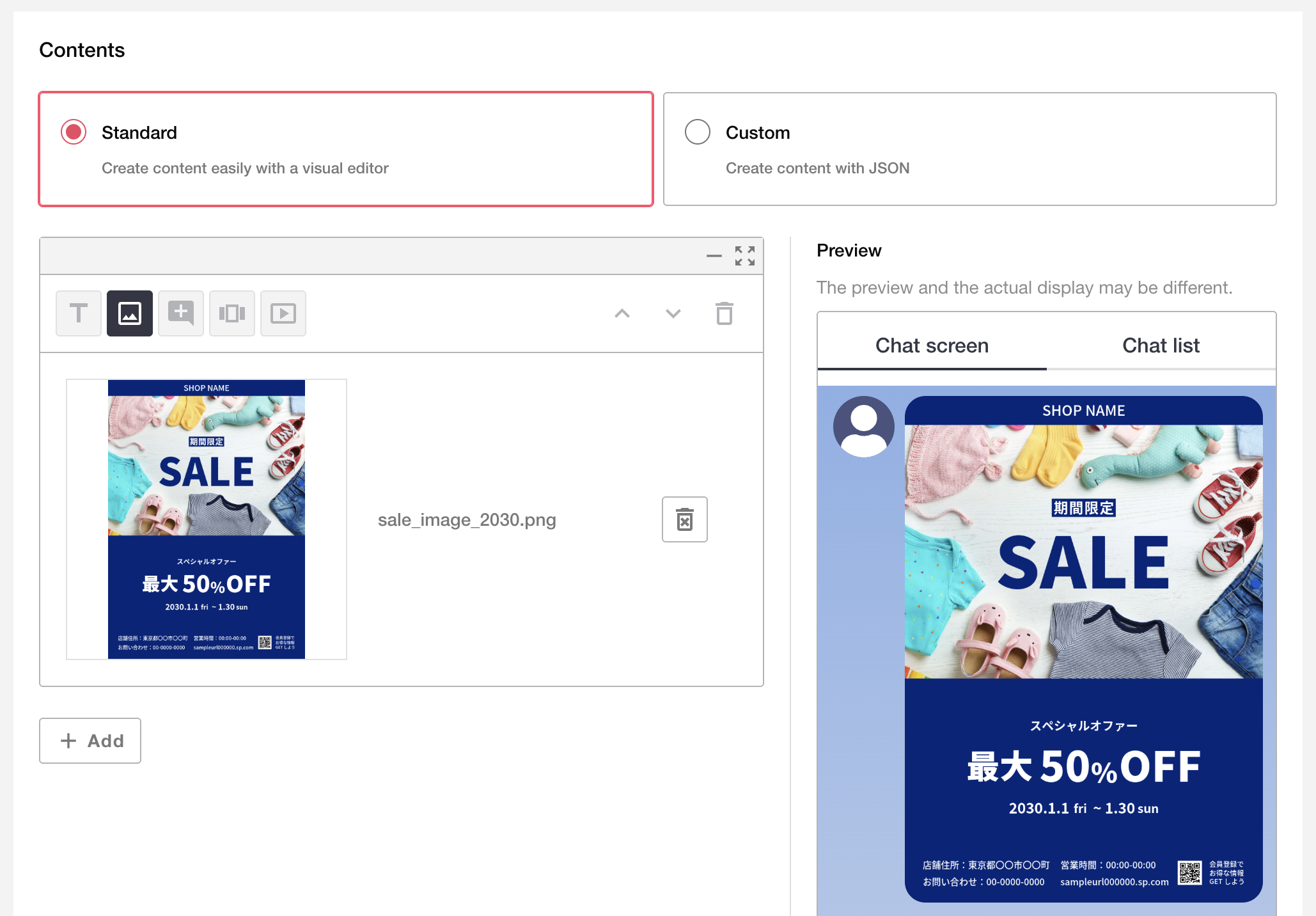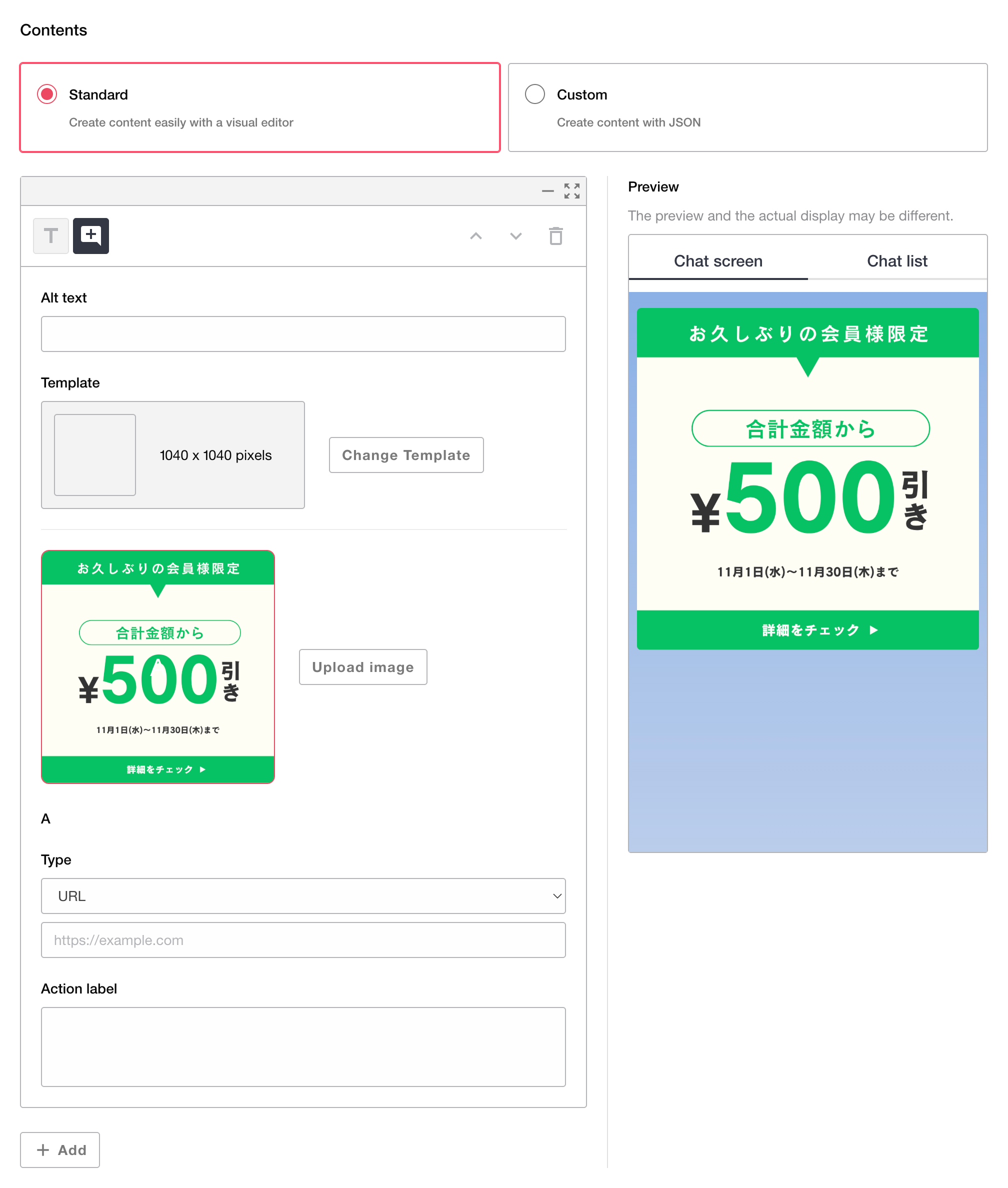 Create content using JSON. The Custom mode supports message types not available in Standard mode, including flexible layouts using Flex messages.