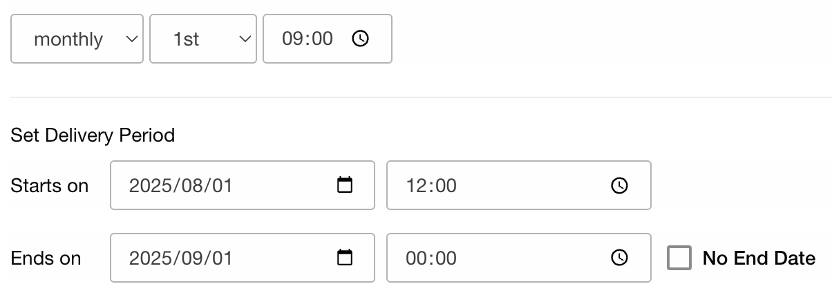 Specify the delivery period, day of the month, and time to send LINE messages monthly. For example, messages can be sent on the 1st of each month at 9:00 AM from January 1 to December 1, 2025. If 'No end date' is checked, the campaign continues until it is unpublished (stopped).