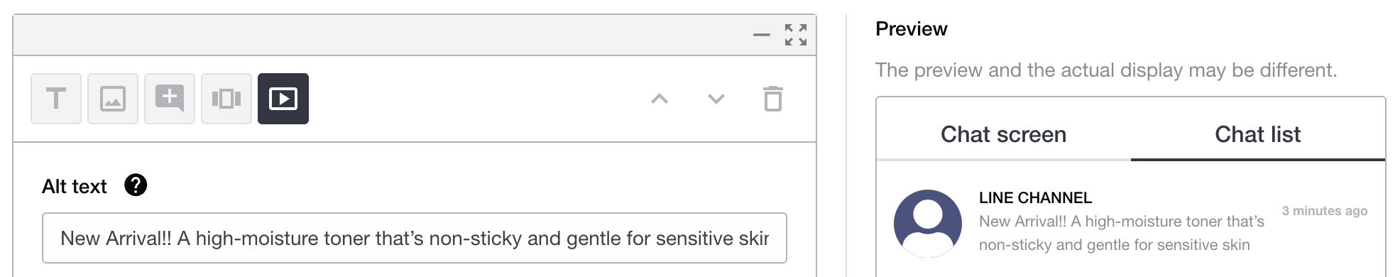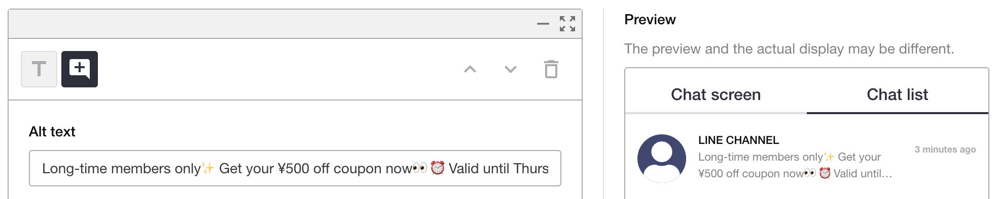 Alternative text appears in notifications and talk lists when the user receives the message. You can preview it by switching to the Talk List tab in the preview panel.