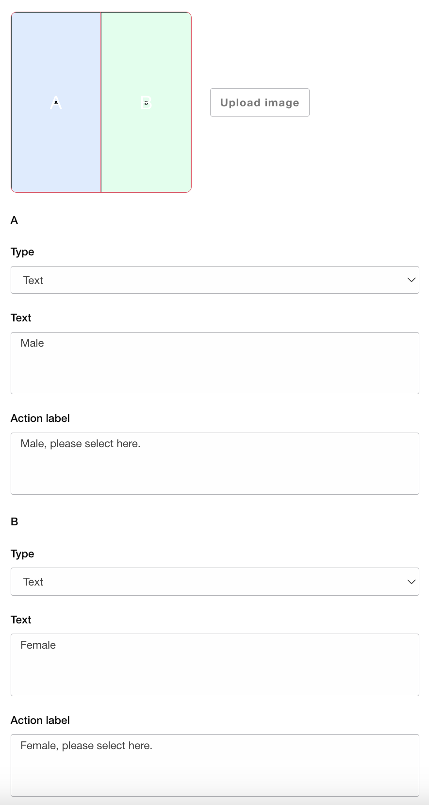 Text — When the area is tapped or clicked, the specified text is sent to the chat room. If the text matches a keyword configured in your auto-response settings, a predefined message will be automatically sent in reply.