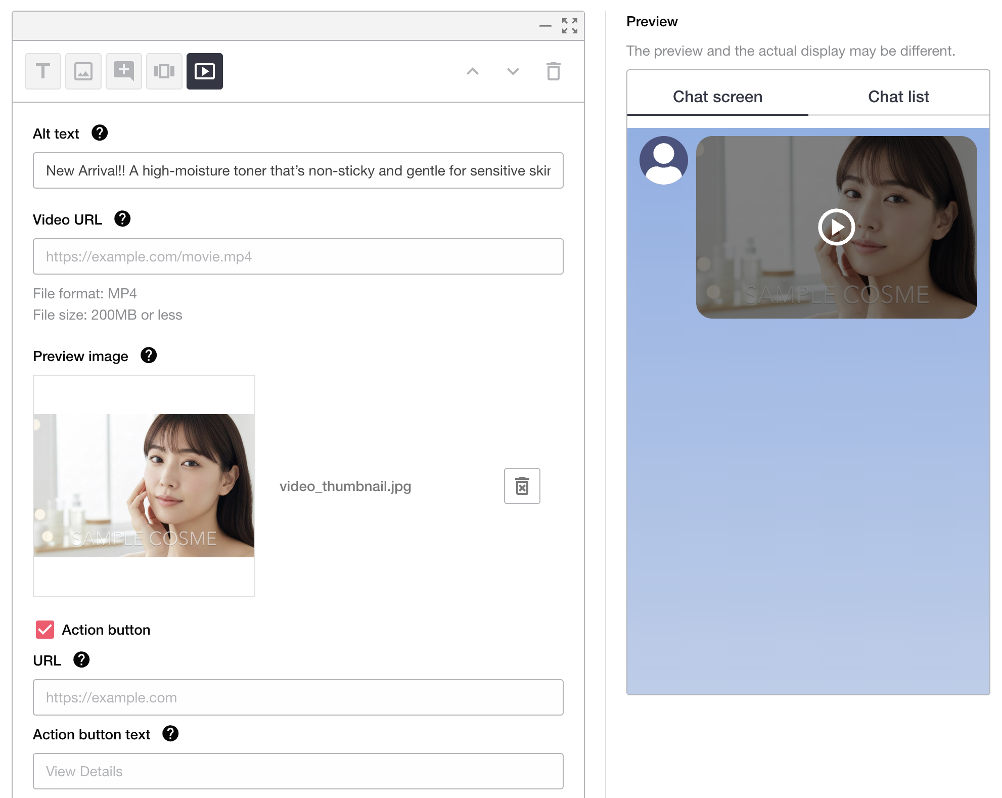 Rich video messages are messages that can deliver videos. The video plays automatically or upon user tap, and after playback completes, you can prompt users to take any desired action. Since users can directly be guided to any desired action after watching the video, displaying links to product pages or corporate websites introduced in the video can significantly enhance conversion rates.