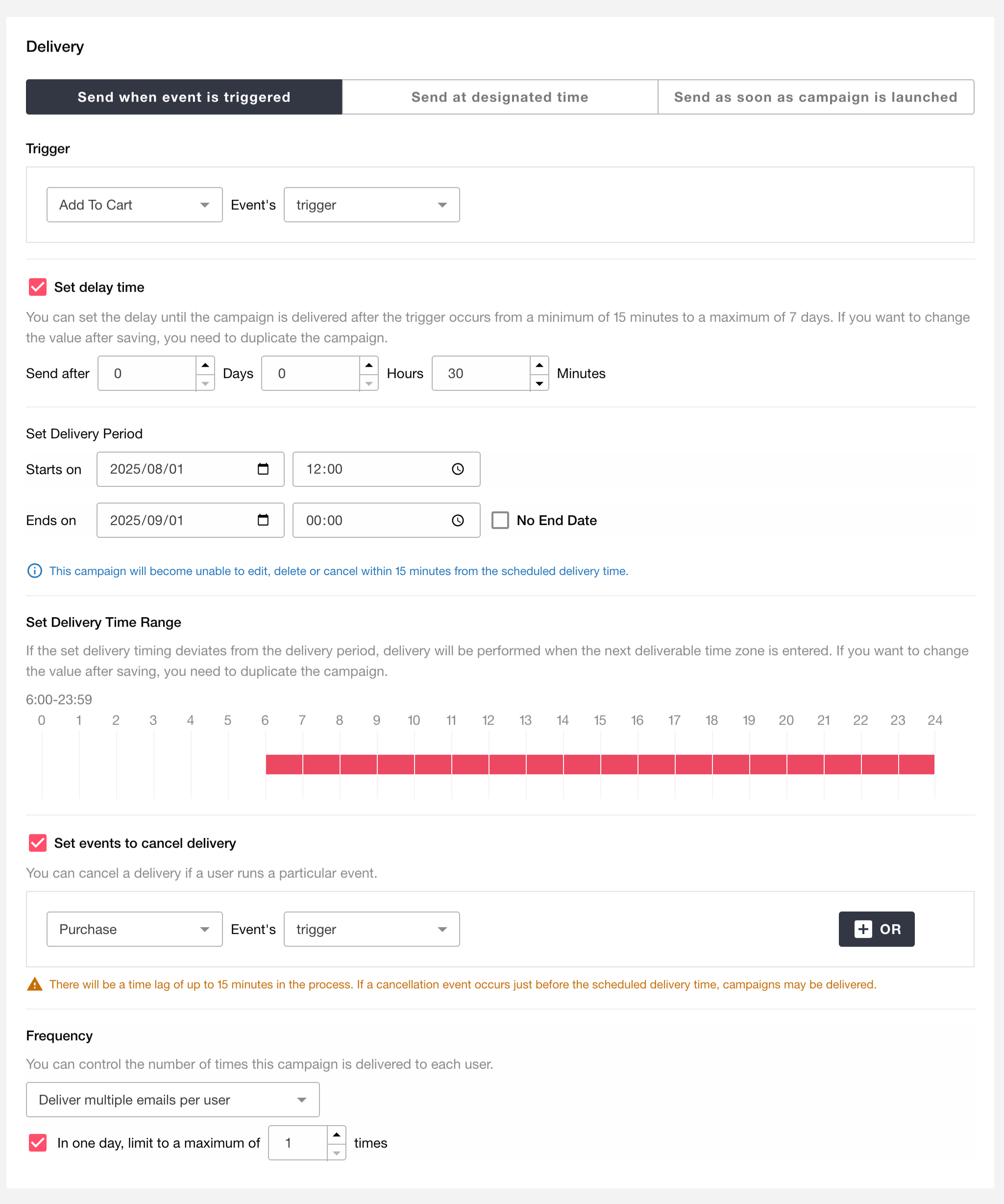 Once a campaign is saved, the delivery time range cannot be changed. If you want to change it, please duplicate the corresponding campaign.