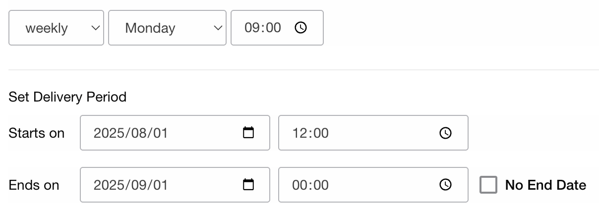 Specify a delivery period, day of the week, and time to send LINE messages weekly. For example, you can deliver messages every Monday at 9:00 AM between August 1 and August 31, 2025. If 'No end date' is checked, the campaign will continue until it is unpublished (stopped).