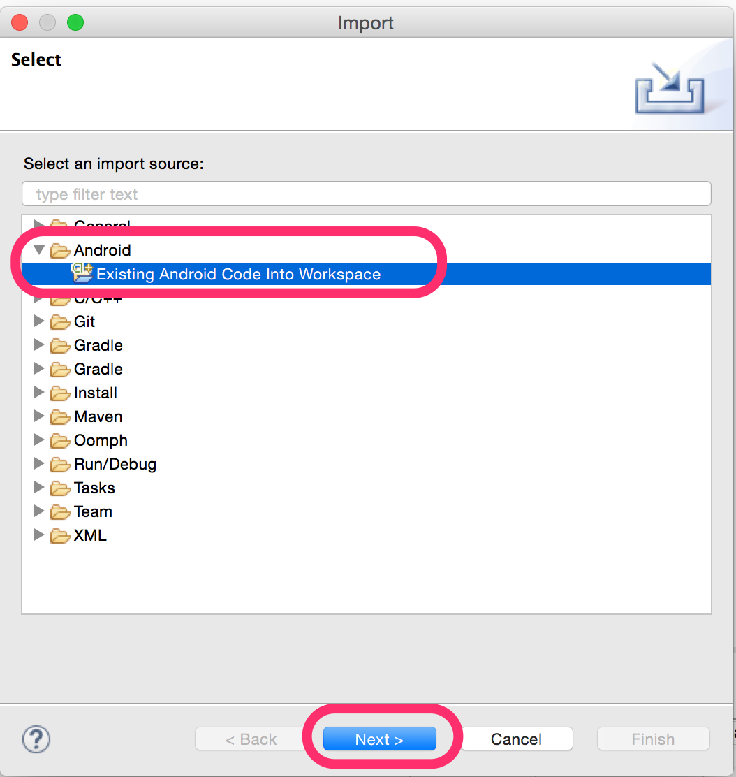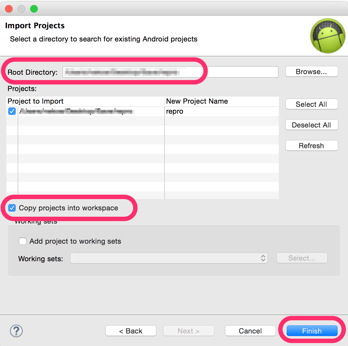 Specify the extracted directory as Root Directory, check Copy projects into workspace and click Finish.