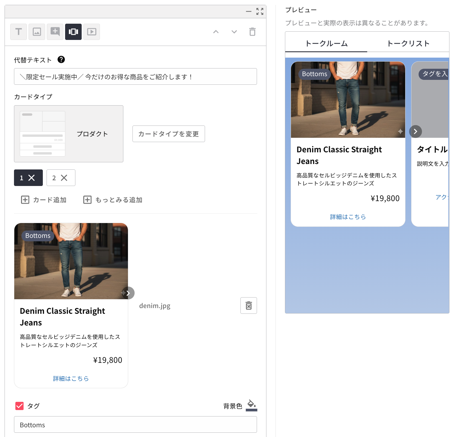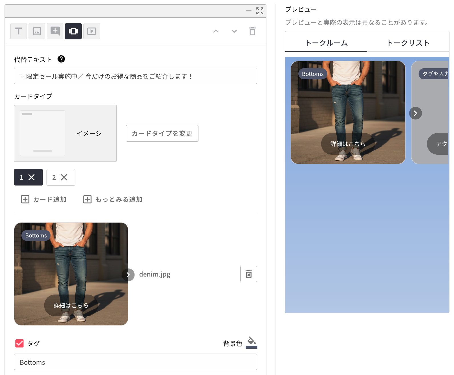 [カード追加] ボタンをクリックしてカードを追加します。カードタブもしくはカルーセルに表示される矢印をクリックすると、編集するカードを切り替えられます。