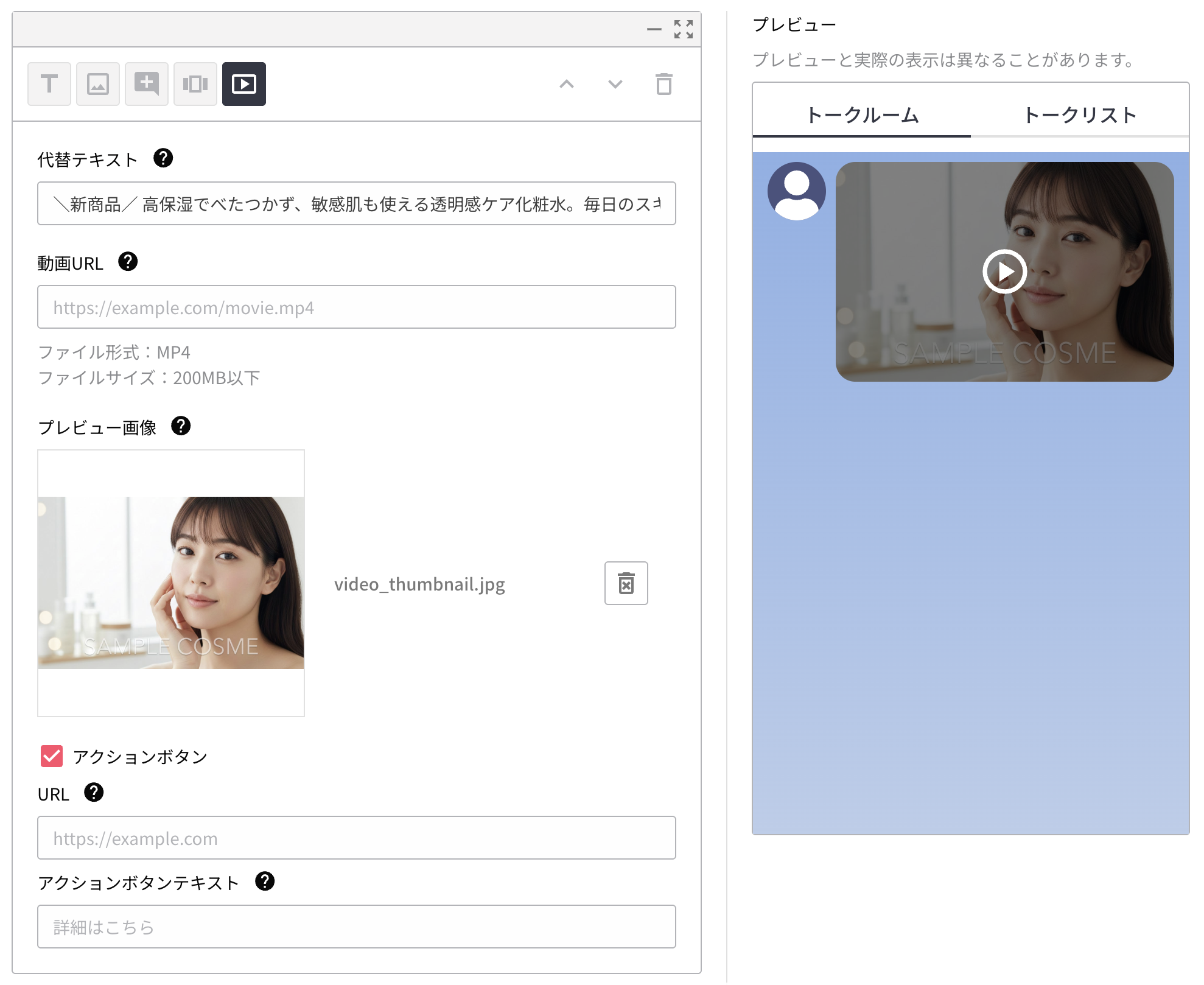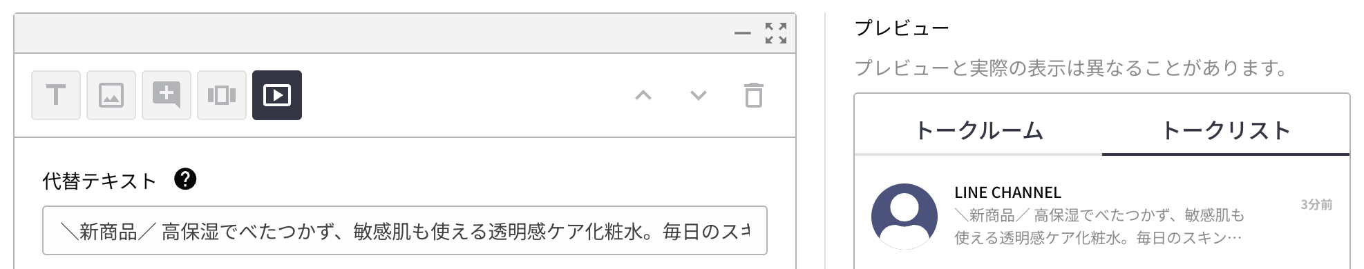 代替テキストは、ユーザーがメッセージを受信した際に通知やトークリストに表示されるテキストです。 プレビューの``トークリスト``タブに切り替えることで表示をプレビューできます。