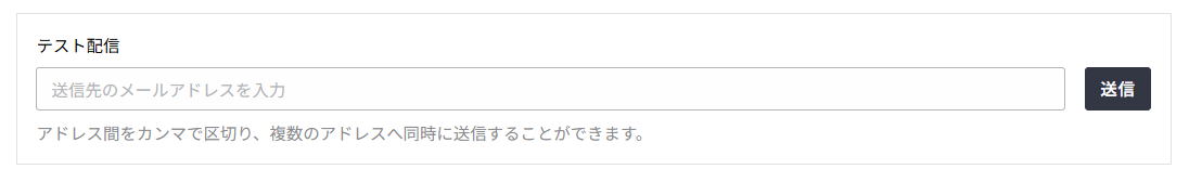 入力した件名、プレヘッダー、本文の表示確認のために、任意のメールアドレスにテスト配信することができます。テスト配信を行うメールアドレスはカンマ区切りで複数指定可能です。