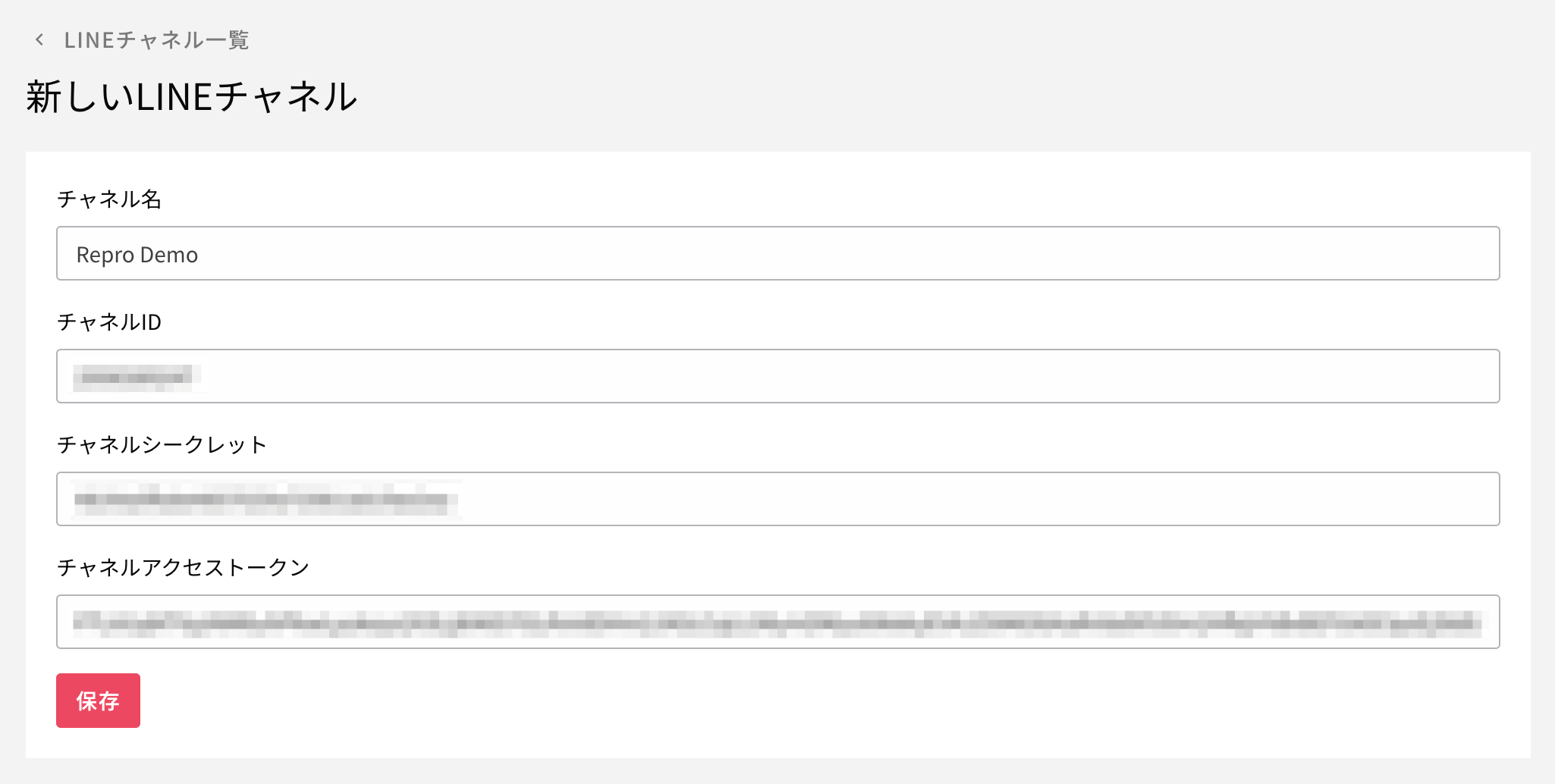 チャネル名、チャネルID、チャネルシークレット、チャネルアクセストークンをそれぞれLINE Developersのチャネル基本設定/Messaging API設定から取得し保存します。